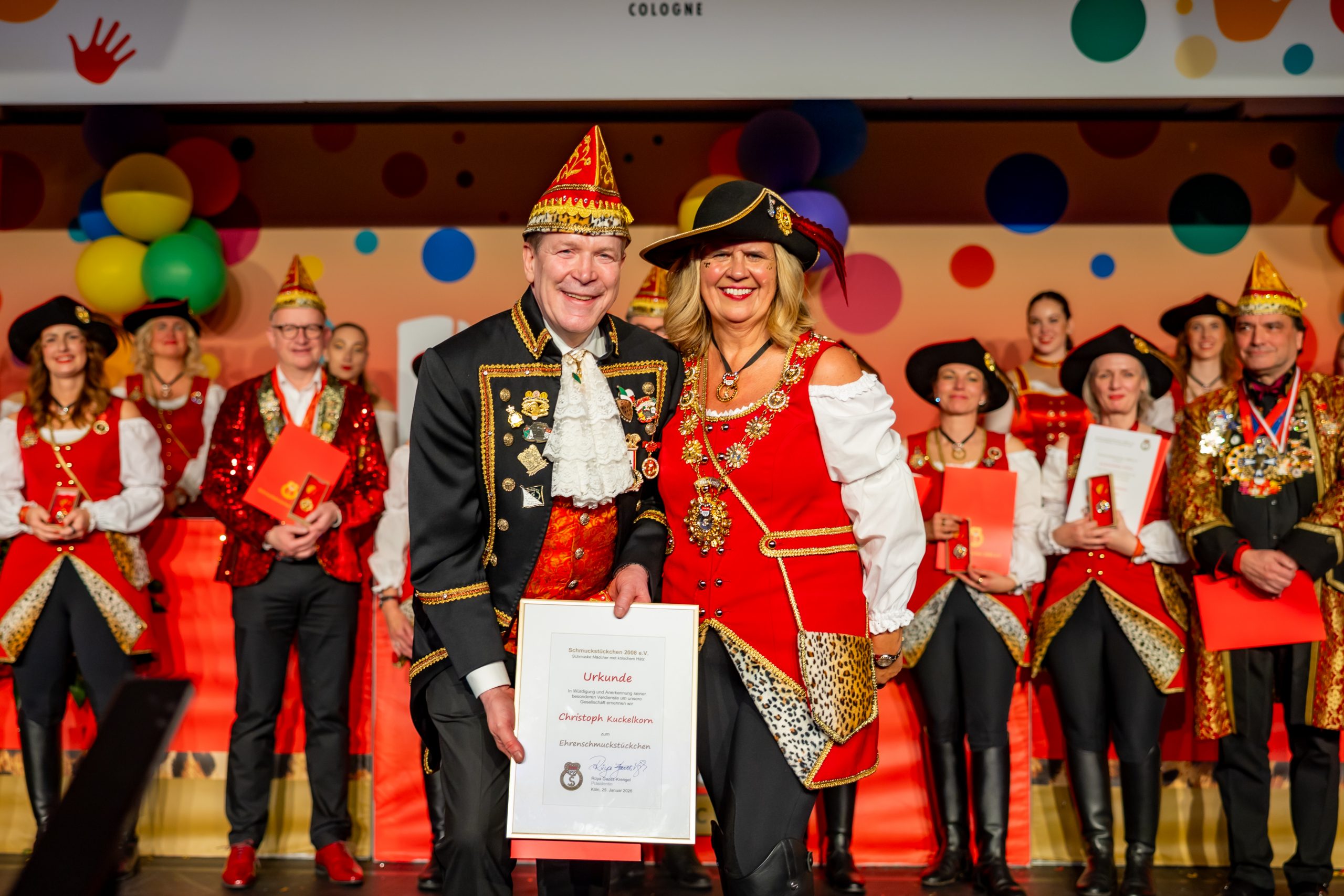 Ganz besonders freuten sich alle Schmuckstückchen darüber, den Präsidenten des Festkomitees, Christoph Kuckelkorn, zum Ehrenschmuckstückchen zu ernennen und sich damit herzlich für seine langjährige Unterstützung zu bedanken.