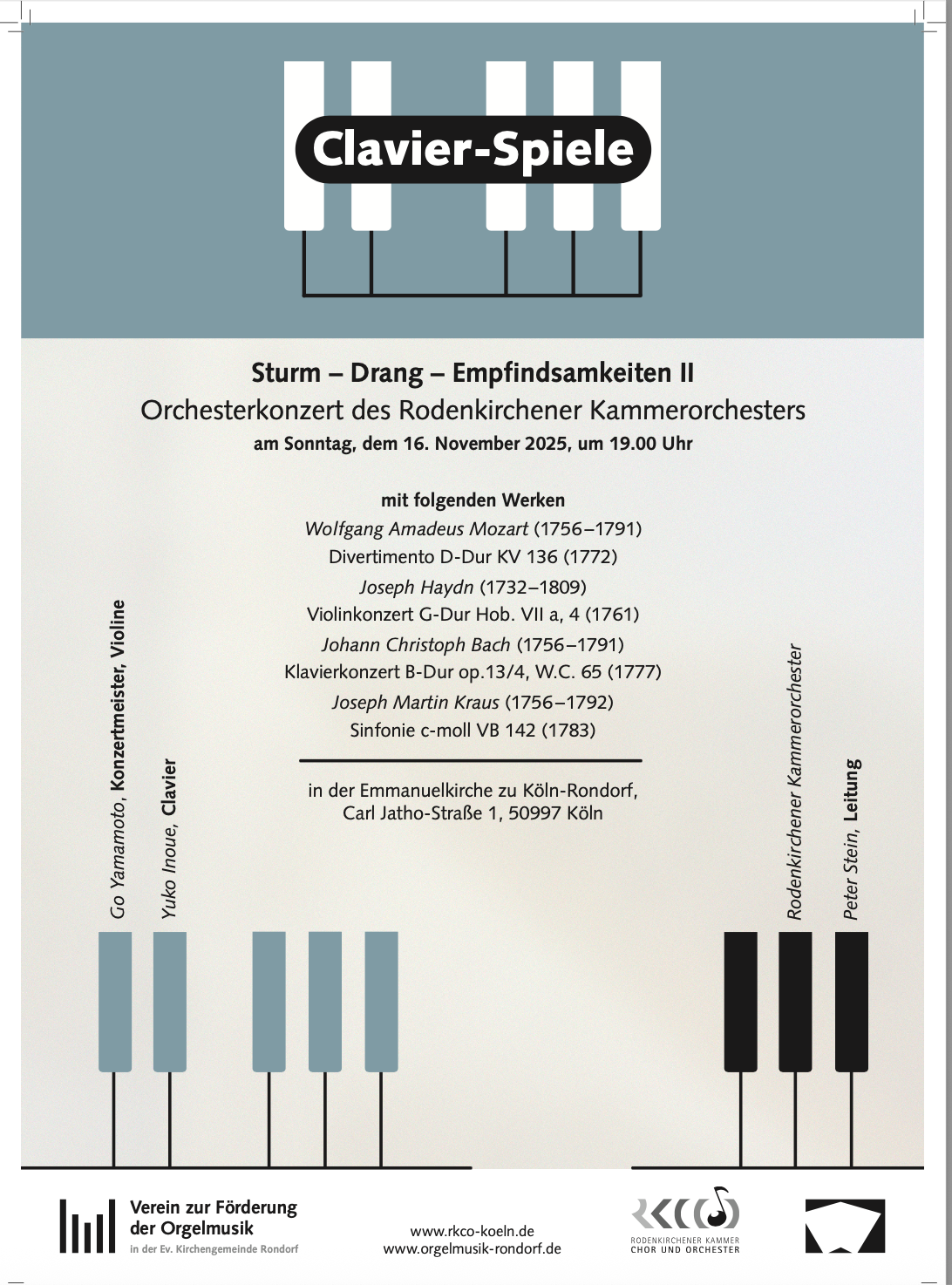 Am Sonntag, 16. November 2025, ebenfalls in der Emmanuelkirche ab 19:00 Uhr, findet im Rahmen der diesjährigen Clavier-Spiele das jährliche Konzert des Rodenkirchener Kammerorchesters statt. Das „Clavier“ tritt hier als Teil der Bassgruppe und als Soloinstrument in Erscheinung. Zu erleben sind Konzertmeister Go Yamamoto als Solist in Haydns Violinkonzert und als Leiter des Divertimentos von Mozart sowie Yuko Inoue in Johann Christoph Bachs Klavierkonzert.