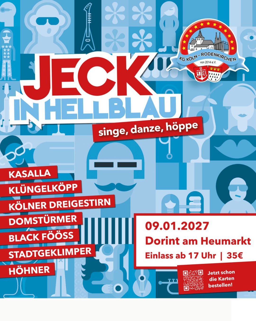 Die fünfte Auflage der „Jeck in Hellblau“, unter dem Motto Singe, Danze, Höppe, findet wie immer im gesamten Erdgeschoss des Dorint Hotels, der Hofburg des Kölner Dreigestirns, statt.