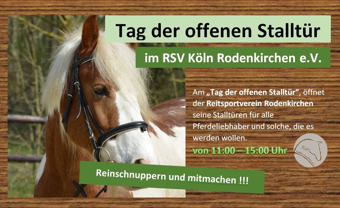 Pferdeliebhaber und solche, die es werden wollen, sind herzlich willkommen! Bei Kaffee und Kuchen, Grillwürstchen und Gesprächen mit Mitgliedern können Reitsport-Interessierte den Reitsportverein Rodenkirchen kennenlernen und einen Einblick in das Vereinsleben gewinnen. Für die Kleinsten ist mit Ponyreiten gesorgt!