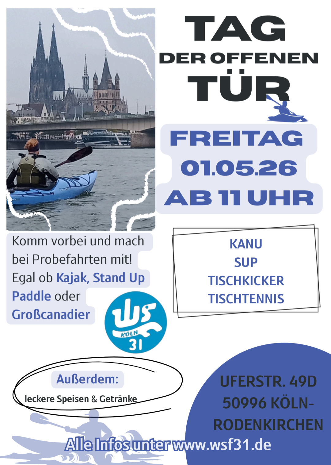 Tag der offenen Tür beim WSF31 Köln, kommt zum Schnupperpaddeln, Getränke und Essen im gemütlichen Bootshaus.