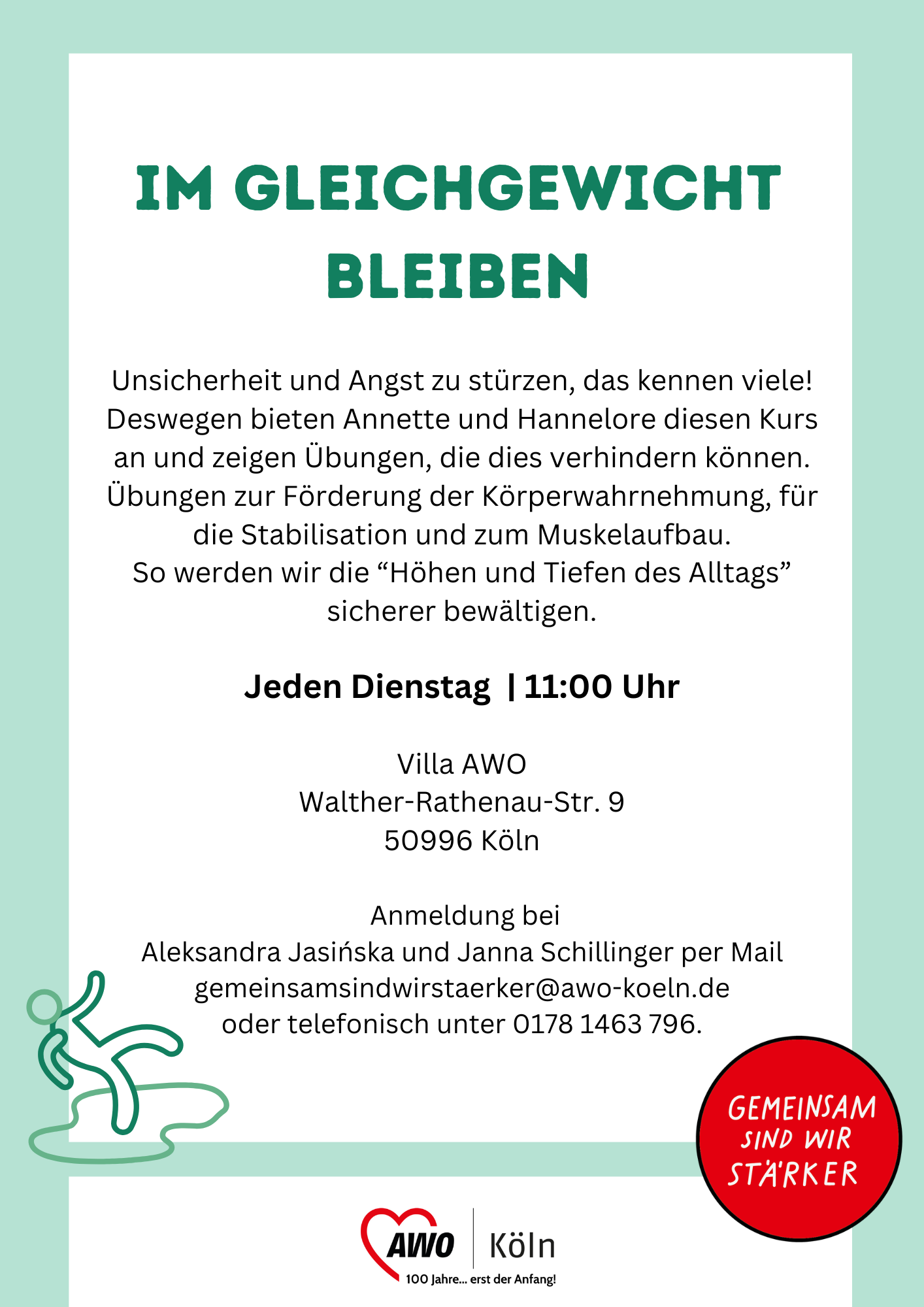 Villa AWO Walther-Rathenau-Str. 9, Köln, NRW, DeutschlandUnsicherheit und Angst zu stürzen, das kennen viele! Deswegen bieten Annette und Hannelore diesen Kurs an und zeigen Übungen, die dies verhindern können. Übungen zur Förderung der Körperwahrnehmung, für die Stabilisation und zum Muskelaufbau. So werden wir die “Höhen und Tiefen des Alltags” sicherer bewältigen. Bildquelle: AWO