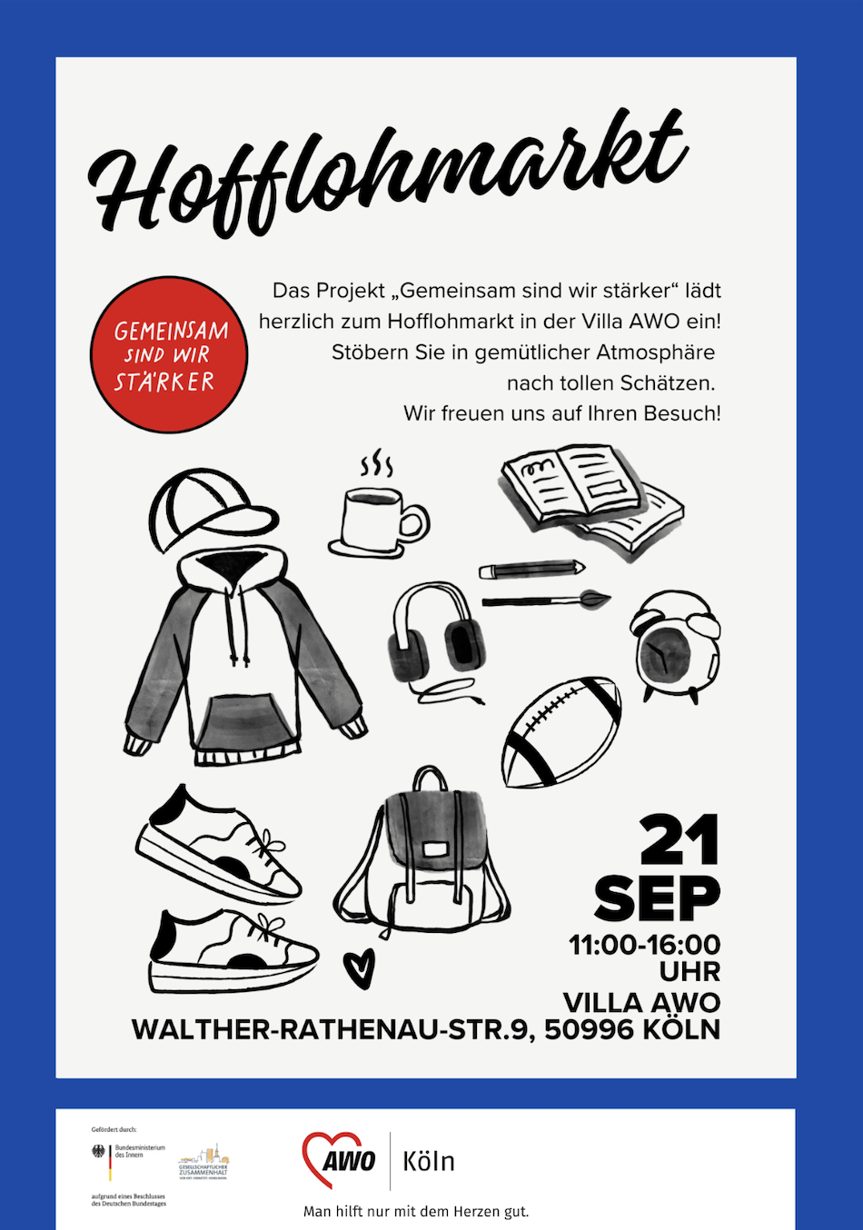 ![]() Das Team der Villa AWO lädt Sie herzlich zum Hofflohmarkt ein. Kommen Sie vorbei und stöbern Sie in Ruhe.