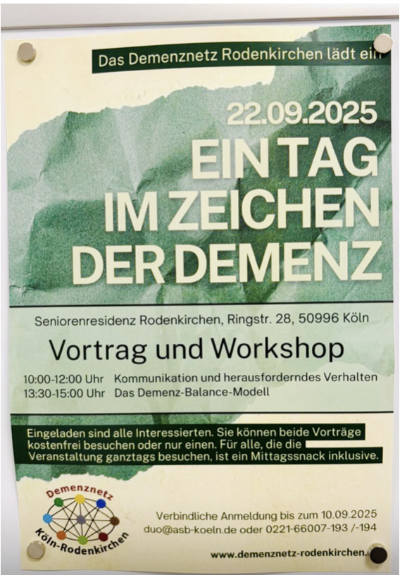 ![]() Vortrag und Workshop 10-12 Uhr Kommunikation und herausforderndes Verhalten 13.30-15 Uhr Das Demenz-Balance-Modell Eingeladen sind alle Interessierten. Sie können beide Vorträge besuchen oder nur einen. Ein Mittagssnack für alle, die die Veranstaltung ganztägig besuchen, ist inklusive. Verbindliche Anmeldung bis zum 10.09.2025 duo@asb-koeln.de oder 0221-66007-193/194