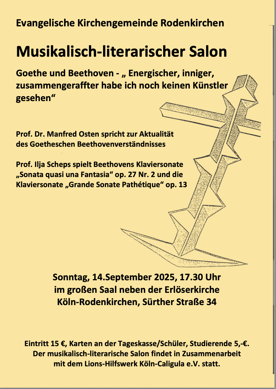 ![]() Zum ersten Mal findet im großen Saal neben der Erlöserkirche ein Musikalisch-Literarischer Salon für alle Freunde von Literatur und Musik statt. Er stellt Goethe und Beethoven in den Mittelpunkt. Prof. Dr. Manfred Osten spricht als ausgewiesener Goethekenner und begeisternder Vermittler zur Aktualität des Goetheschen Beethovenverständnisses unter dem Leitgedanken „ Energischer, inniger, zusammengeraffter habe ich noch […]