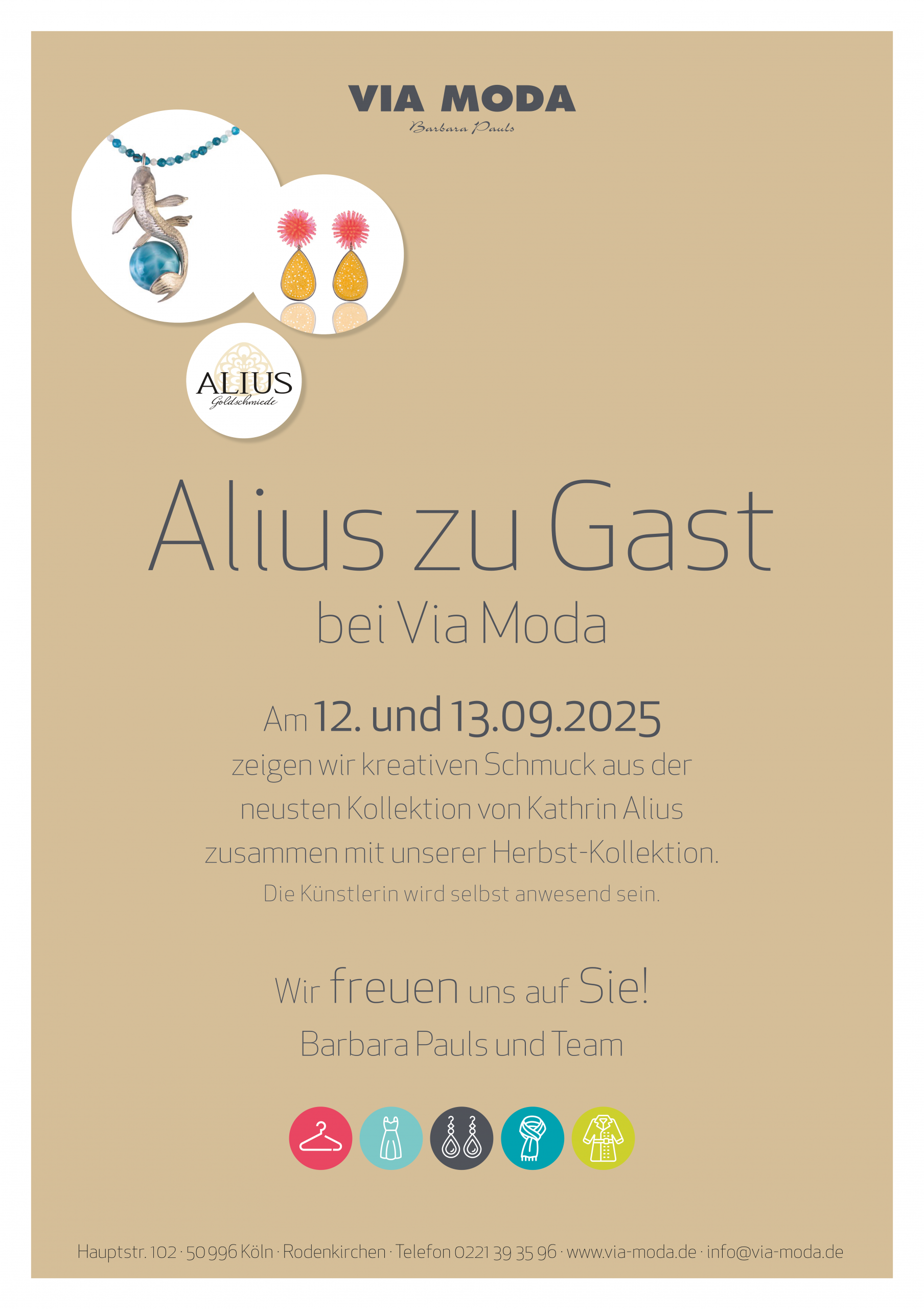 ![]() Am 12. und 13.09.2025 zeigen wir kreativen Schmuck aus der neusten Kollektion von Kathrin Alius zusammen mit unserer Herbst-Kollektion. Die Künstlerin wird selbst anwesend sein.