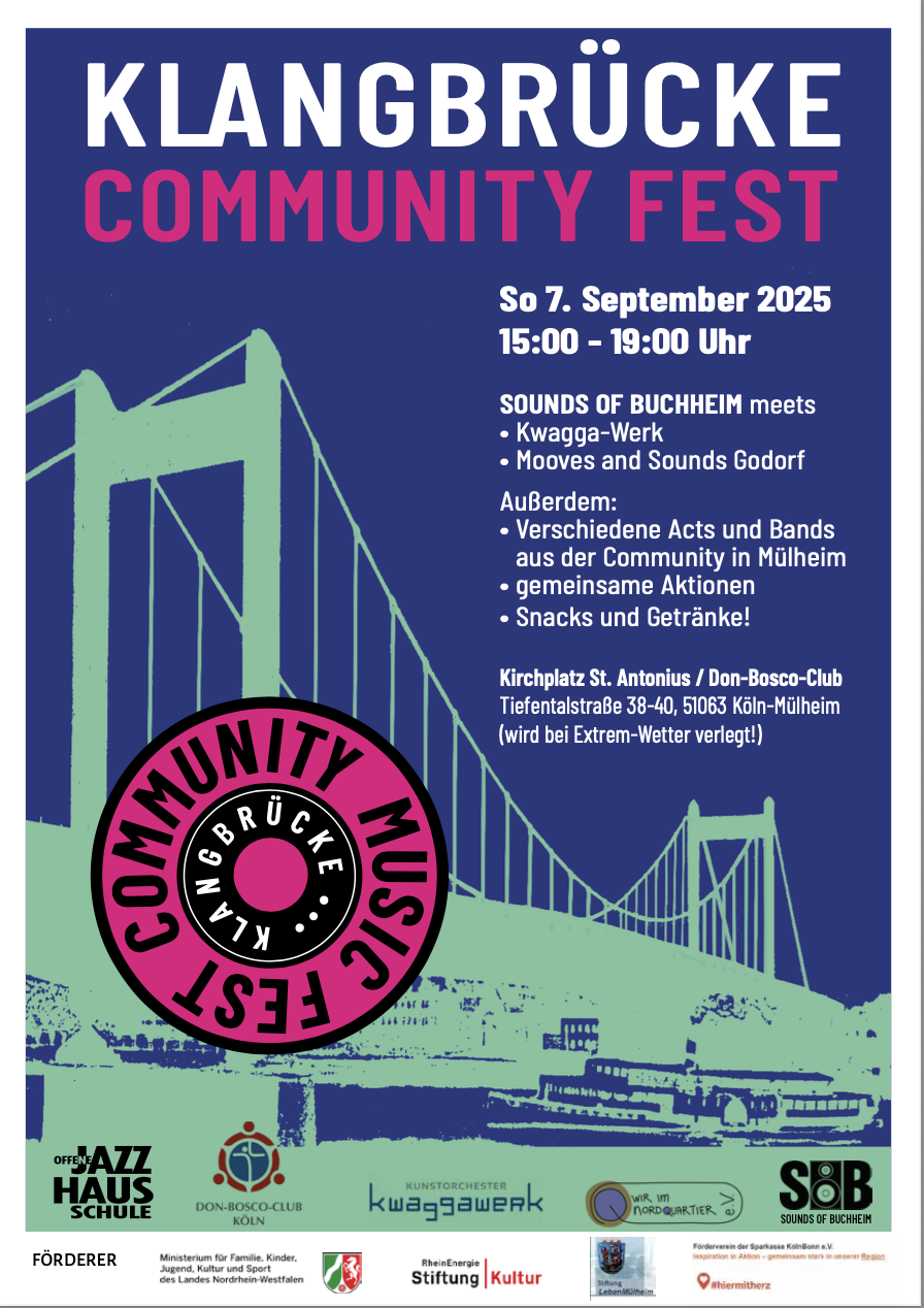 ![]() Erstmals veranstaltet unser barrierefreies Stadtteilorchester „Sounds of Buchheim“ (SOB) der Offenen Jazz Haus Schule in Kooperation mit dem Don-Bosco-Club in Köln Mülheim ein Community-Fest am So, 7. September 2025 von 15:00 - 19:00 Uhr im Außenbereich des Don-Bosco-Clubs und der Kirche St. Antonius, Tiefentalstr. 40, 51063 Köln Mülheim. SOB möchte Menschen, die im Bezirk Mülheim […]