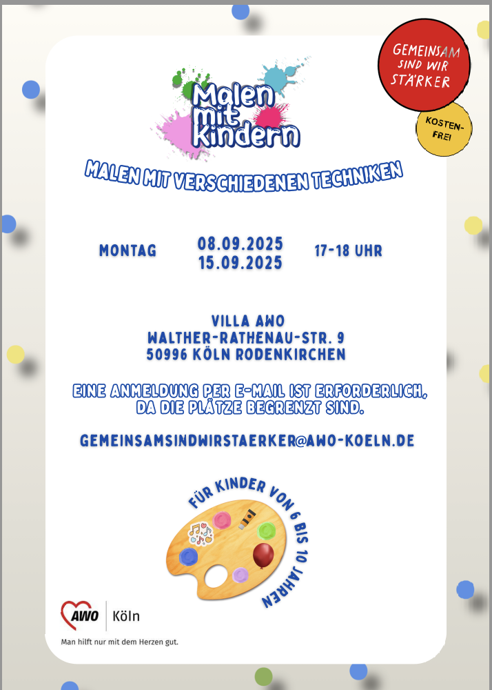 Wann: Samstag, 20. September 2025, 13-17 Uhr Wo: Marktplatz Köln-Mülheim, Berliner Straße 29 Was erwartet euch? Bühnenprogramm: ANGELS Aerials Flughtheater, die Bands „Too loud“, „Daydream“ und „Seventyseven“ des Rhein-Gymnasiums, Syavash Rastani, DJ* Yasmin Habibullah Spiel- und Bewegungsstationen: Fußball, Badminton, Gummitwist und Seilchen springen, Gesellschaftsspiele uvm. Kreative Mitmach-Aktionen: Traumfänger basteln, eure Wünsche und Ideen für Mülheim, Theaterspiele, […]