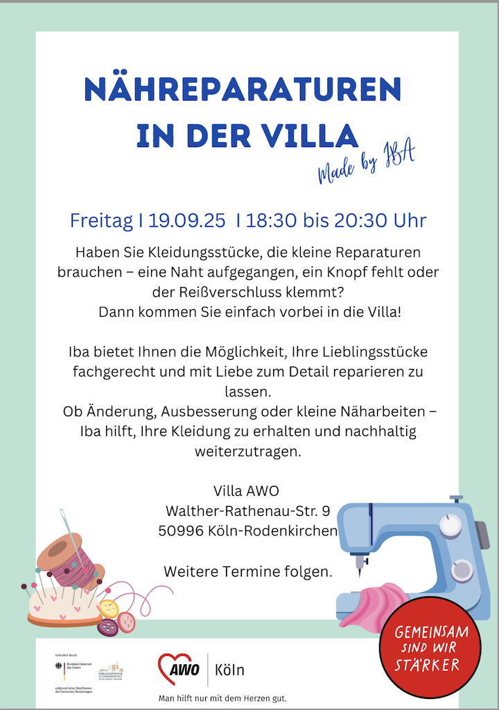 ![]() Lieblingsstücke retten statt wegwerfen! Ab sofort können Sie in der Villa Ihre Kleidung zur Reparatur bringen – ob Knopf annähen, Reißverschluss richten oder kleine Änderungen. Nachhaltig, praktisch und mit Liebe zum Detail. Start 19.09.2025 um18:30 Uhr. Weitere Termine folgen. Kommen Sie vorbei und geben Sie Ihren Textilien ein zweites Leben! Spenden fürs Material sind herzlich […]
