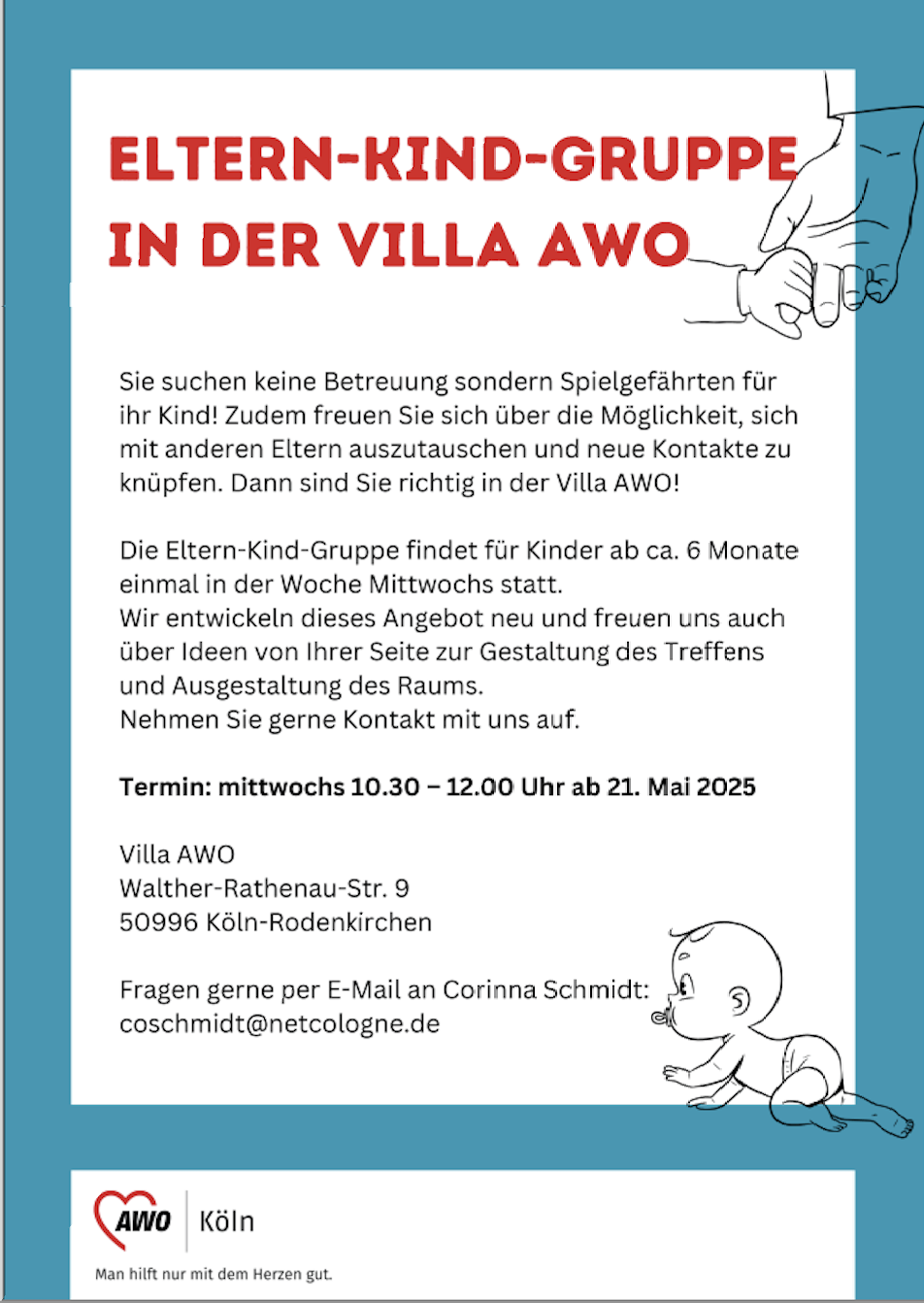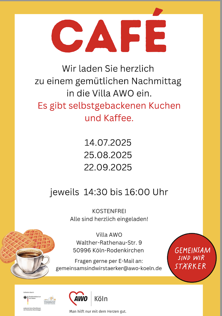 ![]() Wir laden Sie herzlich zu einem gemütlichen Nachmittag in die Villa AWO ein. Es gibt selbstgebackenen Kuchen und Kaffee. Wir freuen uns über Spenden.
