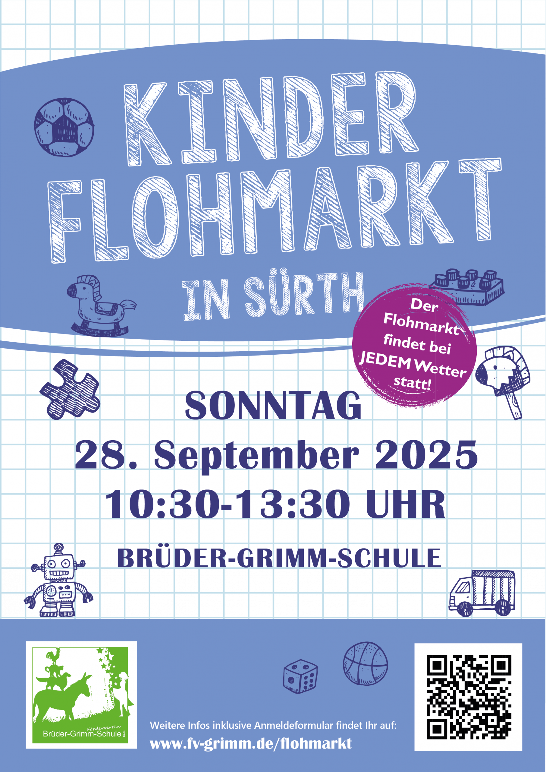 ![]() Am Sonntag, 28.September 2025, findet auf dem Schulhof der Brüder Grimm Schule (BGS) der nächste Flohmarkt statt! Für eine kleine Stärkung sorgt eine Cafeteria mit leckerem Kuchen sowie kalten und warmen Getränken.