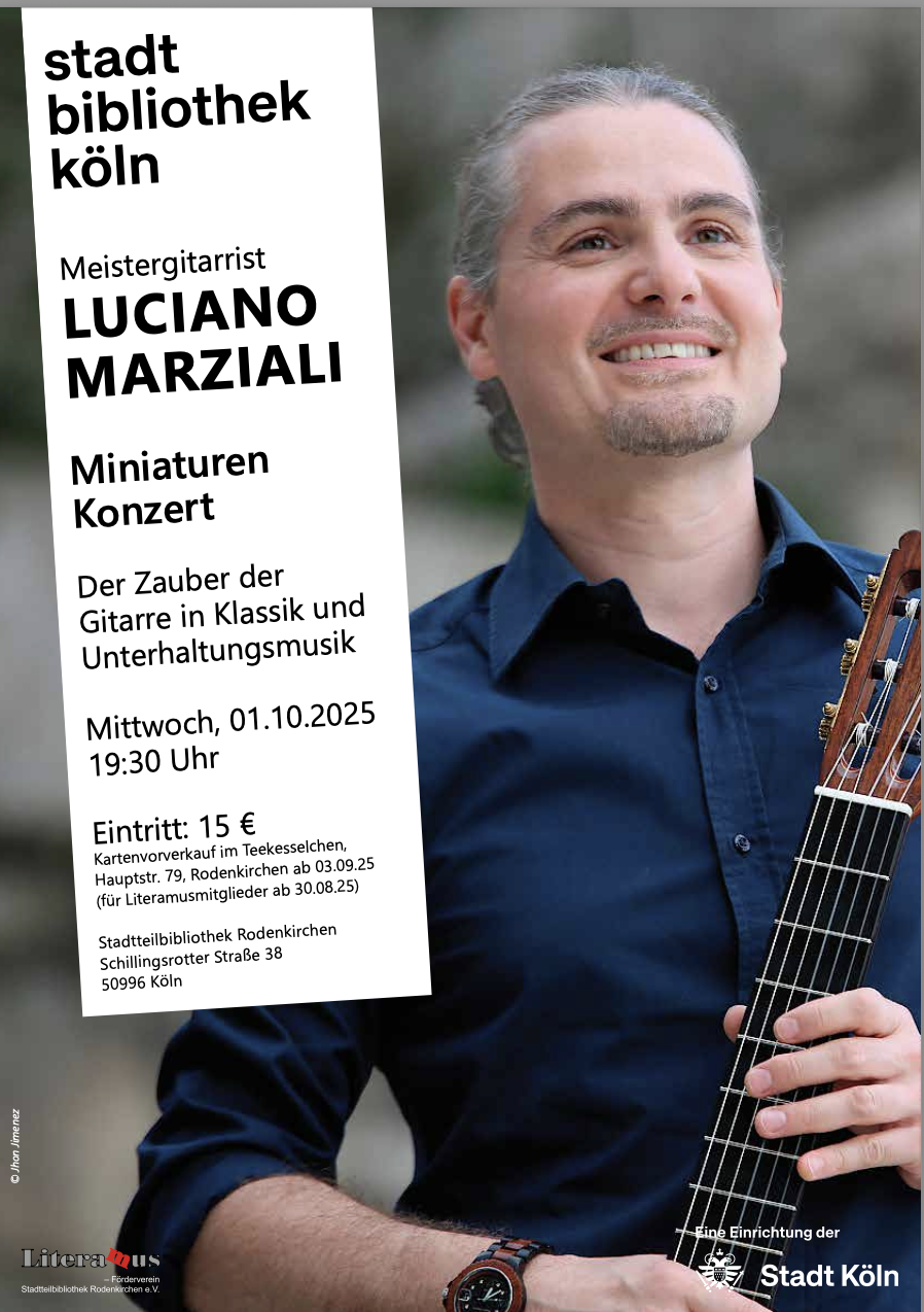 ![]() Wir freuen uns auf Luciano Marziali, einen Zauberer an der Gitarre, der sein Publikum mit einer gekonnten Mischung aus anspruchsvollen, klassischen Stücken und unterhaltsamer Musik, begeistert. Anhand der kleinsten Kompositionsform, der Miniatur, präsentiert der gebürtige Italiener in der Stadtteilbibliothek Rodenkirchen diverse Werke bekannter, meist italienischer Komponisten und kombiniert sie mit Ausflügen in die klassische Literatur, kurzen packenden Geschichten und […]