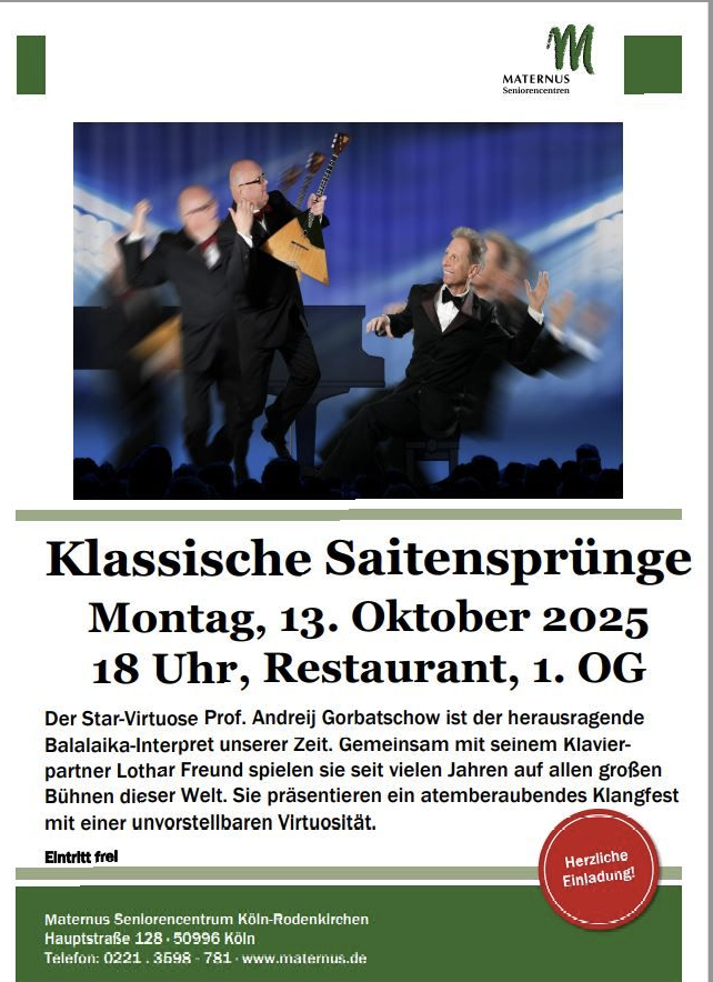 ![]() Der Kölner Liedermacher Jörg Dahmen präsentiert mit der Keyboardbegleitung von Maik Müller sein komplett in kölscher Sprooch selbst geschriebenes Programm "Leise Lieder", mit dem er seit drei Jahren erfolgreich auf der Bühne steht. Kein Abend ist wie der andere und auch dieses Mal ist ein besonderer Gast dabei. Die Violinistin Eva Heineken aus Bonn gibt […]