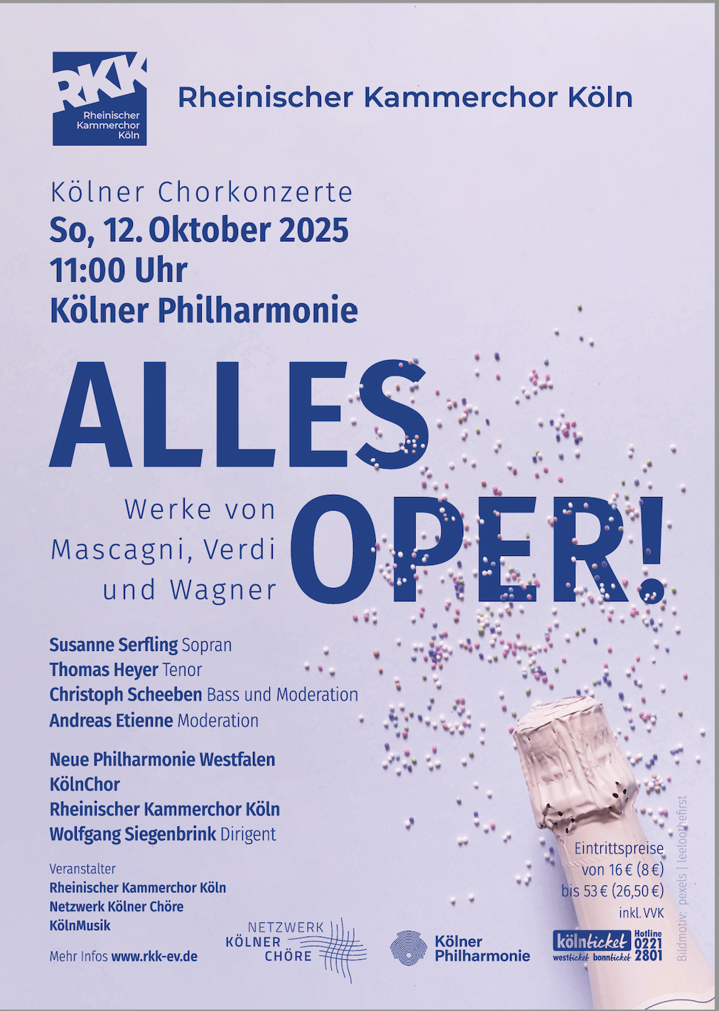 ![]() Auf dem Programm: Meisterhafte Arien und Chöre von Wagner, Verdi und Mascagni. Mitwirkende sind gleich zwei namhafte Kölner Konzertchöre: der Rheinische Kammerchor Köln und der KölnChor. Dazu bekannte Solistinnen und Solisten und die Neue Philharmonie Westfalen. Die musikalische Leitung hat Wolfgang Siegenbrink.