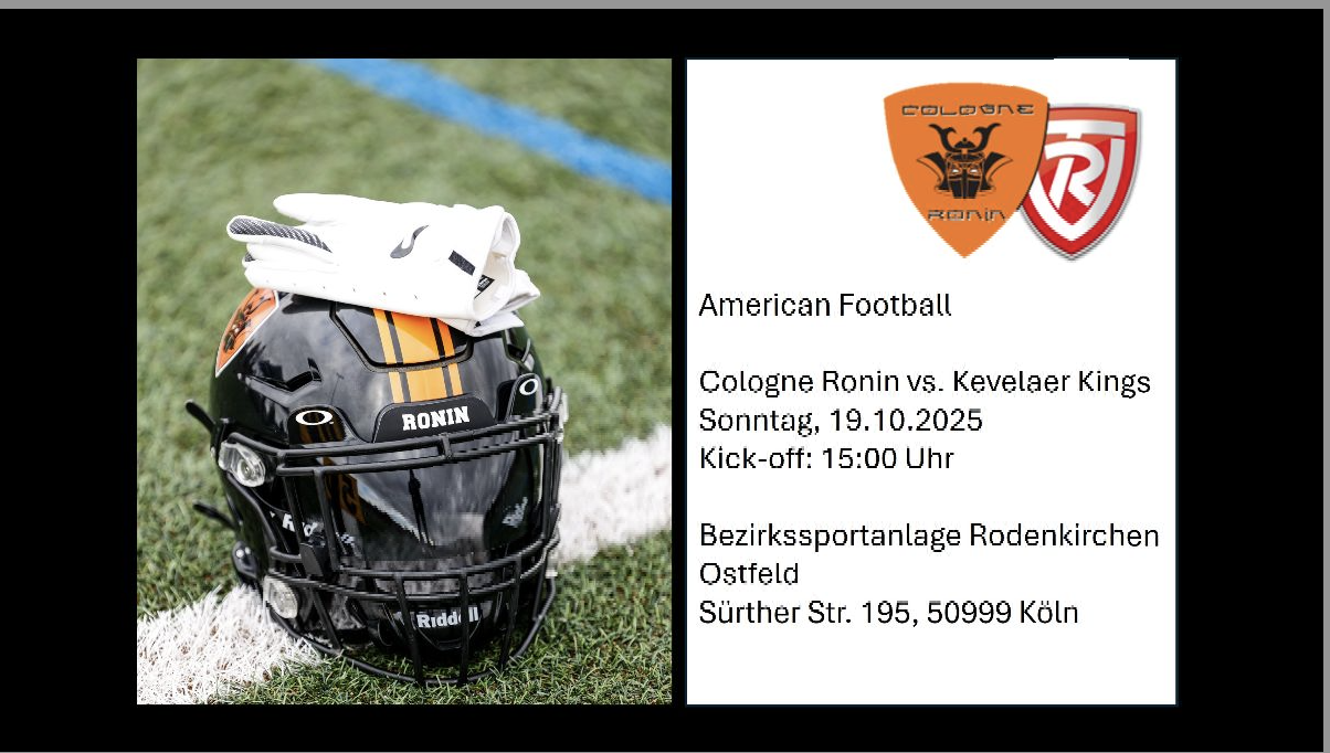 ![]() Wir sind Cologne Ronin, eine American Football Herrenmanschaft aus dem Kölner Süden. Wir freuen uns über eine wachsende Fanbase und über jeden, der uns an den Spieltagen besucht und uns als Team unterstützt. Kommen Sie gerne vorbei! Der Eintritt ist frei! Cologne Ronin vs. Kevelaer Kings Sonntag, 19.10.2025 Kick off 15:00 Uhr Wo? Bezirkssportanlage Rodenkirchen /Ostfeld […]