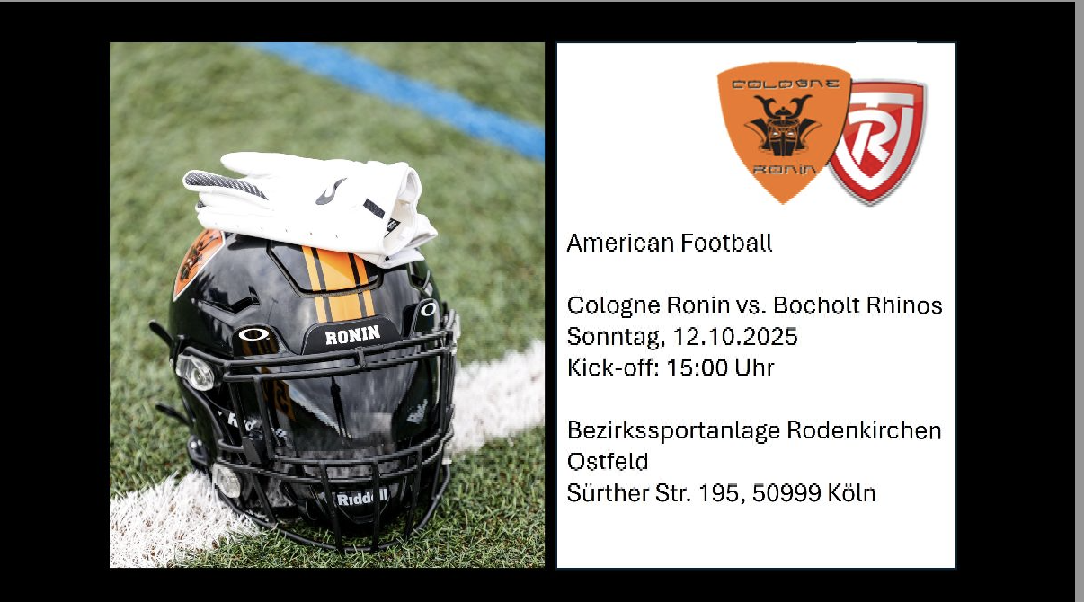 ![]() Wir sind Cologne Ronin, eine American Football Herrenmanschaft aus dem Kölner Süden. Wir freuen uns über eine wachsende Fanbase und über jeden, der uns an den Spieltagen besucht und uns als Team unterstützt. Kommen Sie gerne vorbei! Der Eintritt ist frei! Cologne Ronin vs. Bocholt Rhinos Sonntag, 12.10.2025 Kick off 15:00 Uhr Wo? Bezirkssportanlage Rodenkirchen /Ostfeld […]